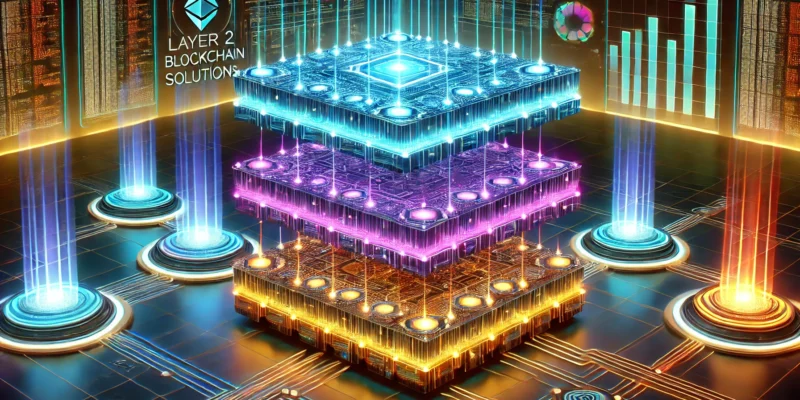 DALL·E 2025 03 26 13.46.16 A futuristic multi layered digital structure representing Layer 1 Layer 2 and Layer 3 blockchain solutions. The layers are stacked like glowing neo